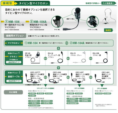 接続用オプション ・イヤホン SP-28 ・イヤホン EH-14 ・イヤホン EH-15 ・イヤホン EH-15B ・接続ケーブル OPC-2277 ・接続ケーブル OPC-636 ・接続ケーブル OPC-637 ・接続ケーブル OPC-661 対応機種 接続表(画像)をご参照ください。